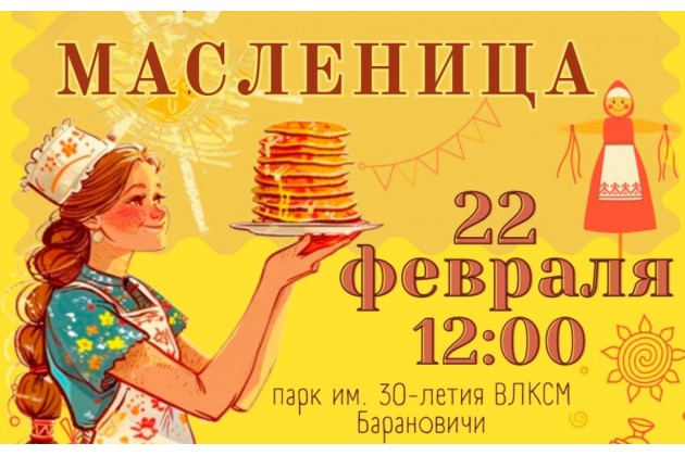 Приглашаем на блины! Народное гуляние Масленица в Барановичах 17 марта 2024. Театрализованный концерт, игры, конкурсы, викторины, выставки, праздничная торговля. Подробнее